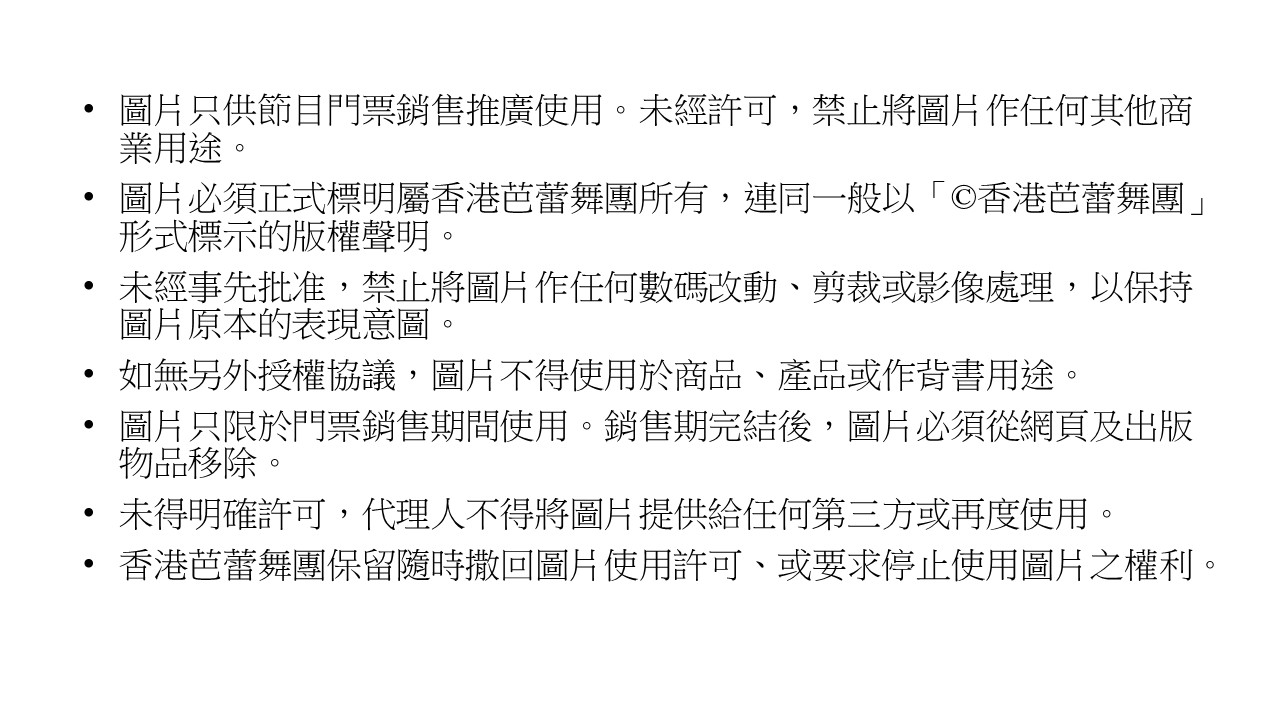 如需要使用節目內容及圖片,可按下方圖片下載,並請遵照香港芭蕾舞團指示。按此閱讀指示。